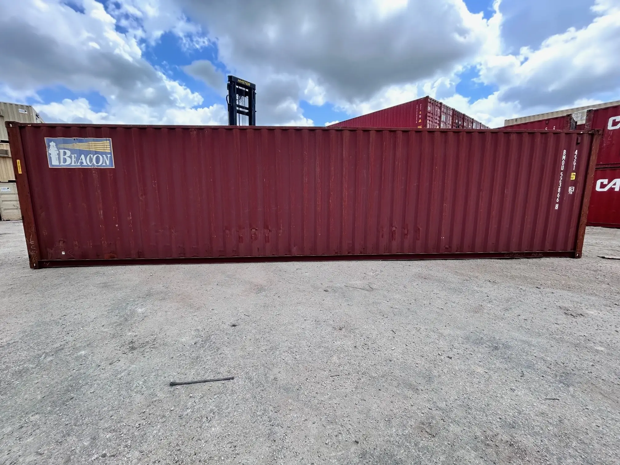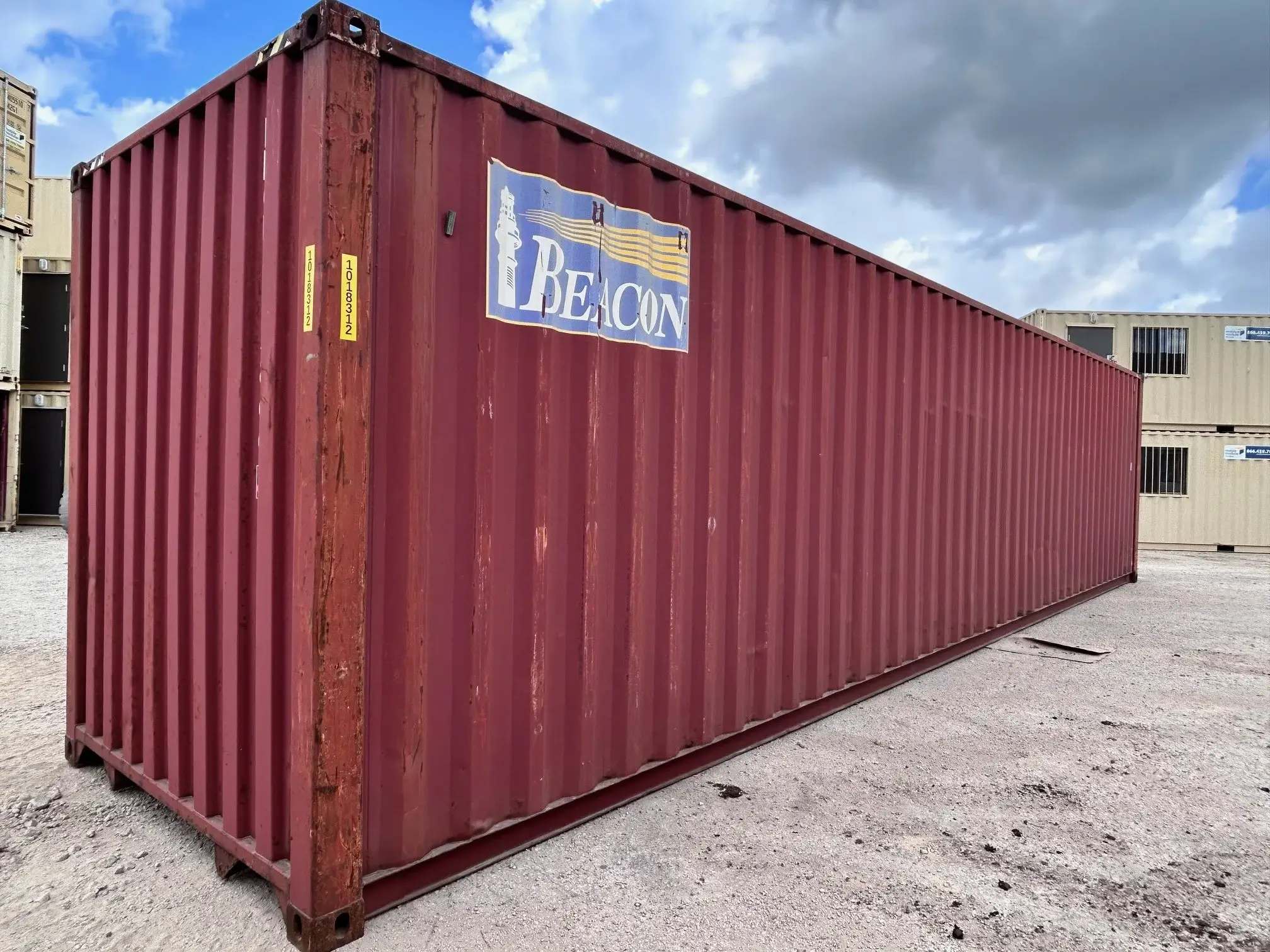 40' steel shipping container inspected and in working condition, showing typical cosmetic wear from age and weather.